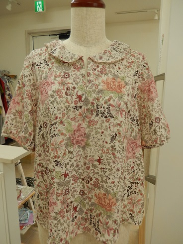 バイヤス裁ちの襟にパイピング仕立てのギャザースリーブ