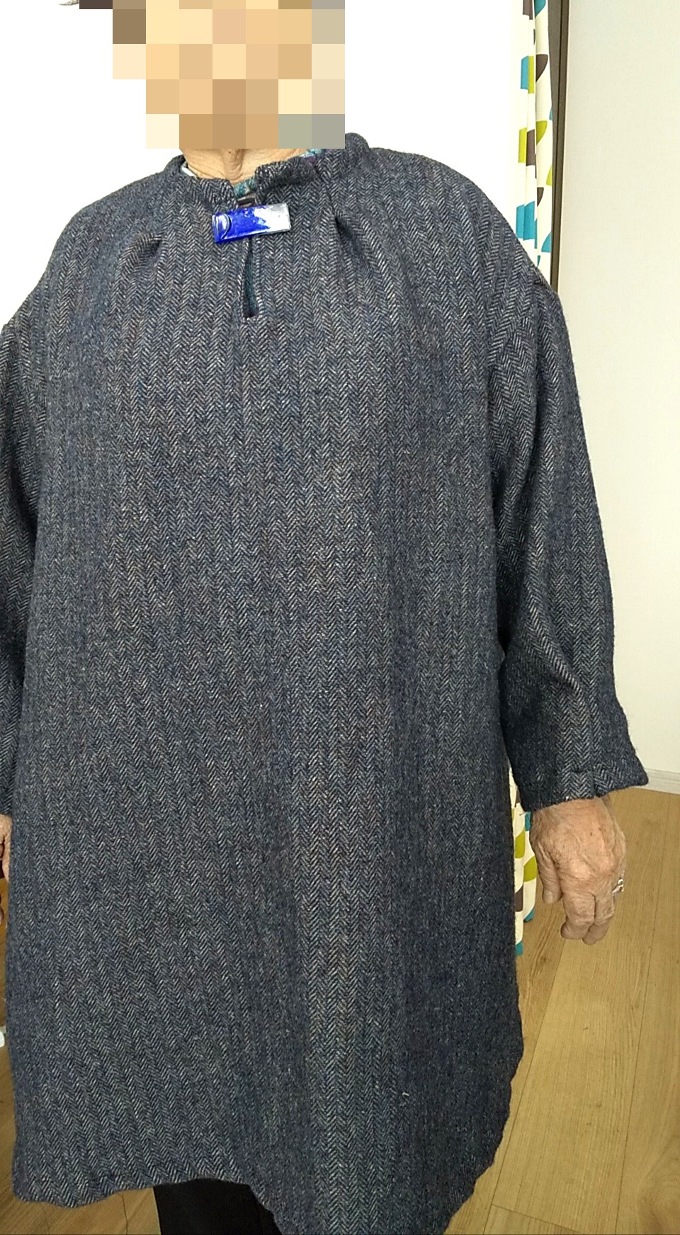 コートワンピース 洋裁教室 X Facebook はてブ Pocket LINE コピー 2019.10.30 これ1枚でコート代わりになるワンピース軽くて暖かい、ヘリンボーンのウールリネン生地でお作りのお客さまです。最後の仕上げをされると完成です。襟元に茶色の革釦をお付けの予定ですが今日はお手製のブローチで止められ写真撮影です。