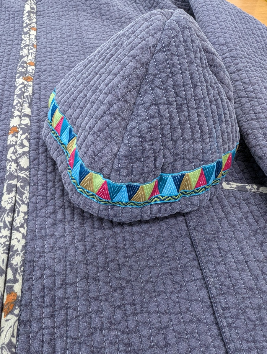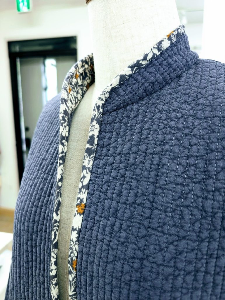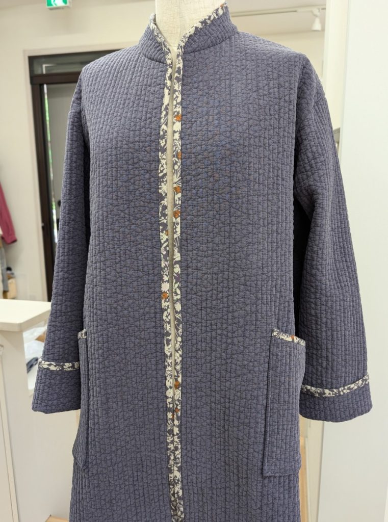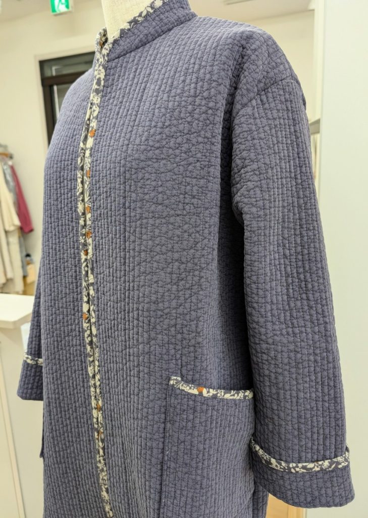 ヌビのコートと帽子 洋裁教室 X Facebook はてブ Pocket LINE コピー 2025.06.18 ヌビのコートをお作りのお客様です。お客様の工夫点は、プリント生地でバイヤスをお作りになり、袖口、ポケットだけでなく身頃もぐるっと、パイピングにされたところです。残り布で、ご家族の方の帽子もお作りです。帽子のポイントはUSAリボンです。
