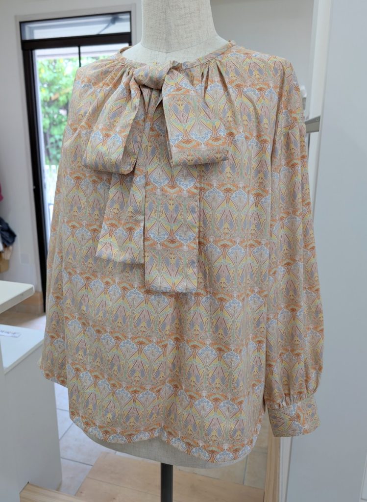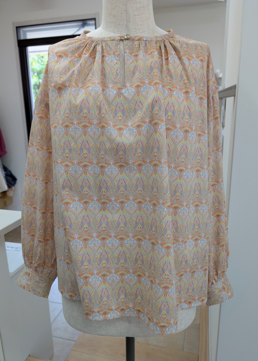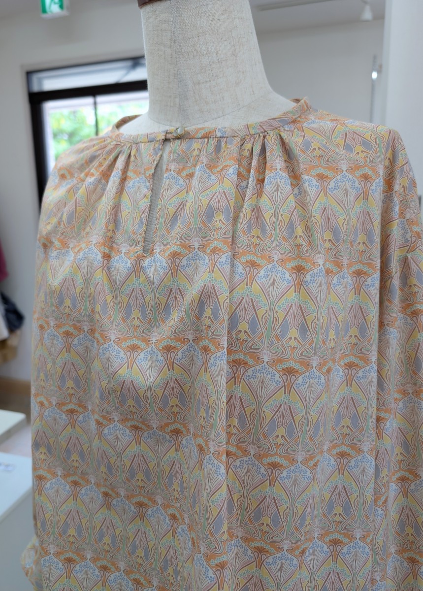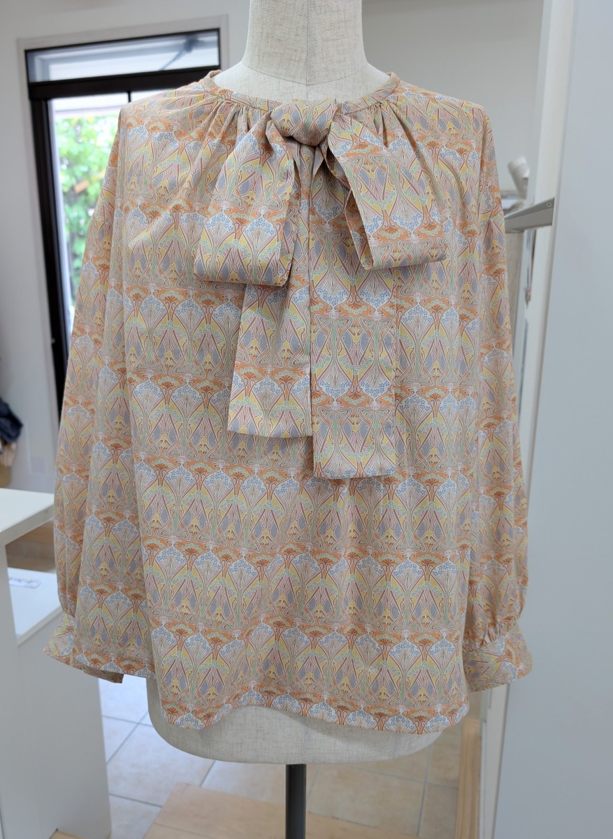 お2人目のふんわりブラウス 洋裁教室リバティプリントで X Facebook はてブ Pocket LINE コピー 2025.06.26 りぼんの取り外し可能なふんわりブラウス。リバティプリントでお作りのお客様です。生地と形がぴったり。華のあるブラウスになりました。