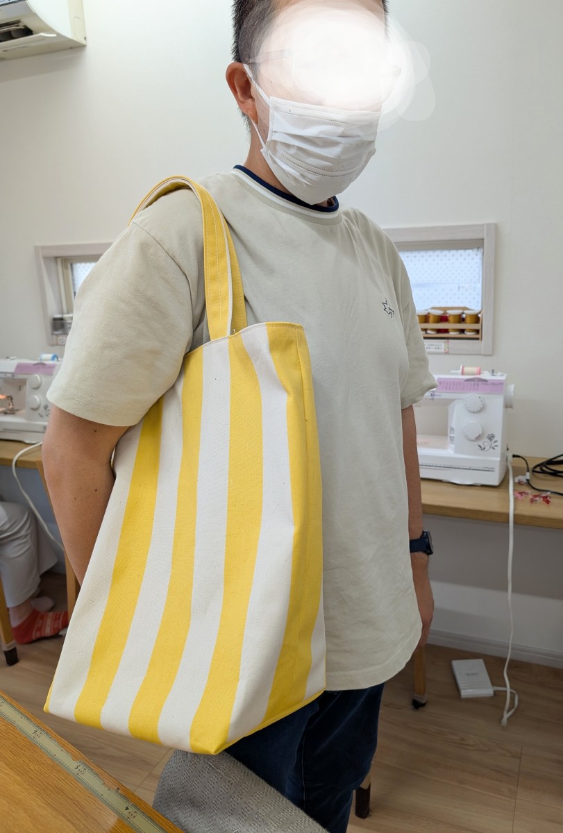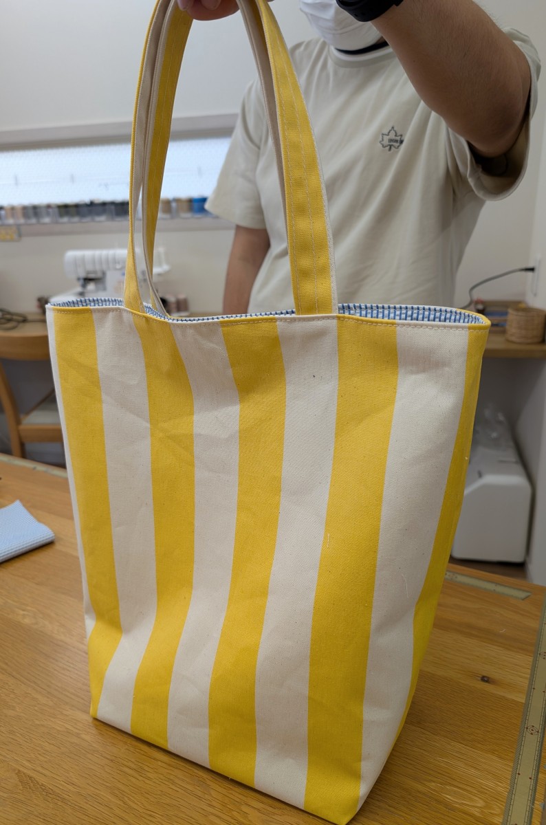 基本的な縫い方の要素 洋裁教室トートバッグに挑戦されました X Facebook はてブ Pocket LINE コピー 2025.09.08 基本的な縫い方の要素が詰まっており、少しずつ変化させて、いろんな作品に応用できるものをまず、作ってみたいと男性のお客様です。ロックミシンを使用しなくてもできる、裏付きのトートバッグに挑戦されました。次は、かわいいお嬢さんのものにご挑戦くださいね。
