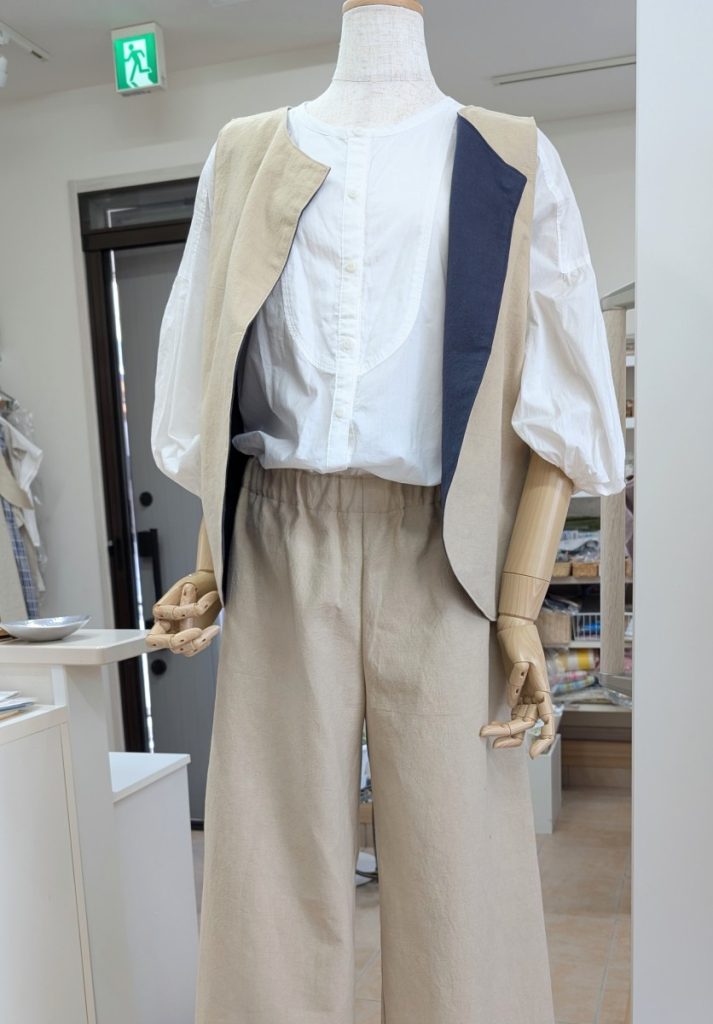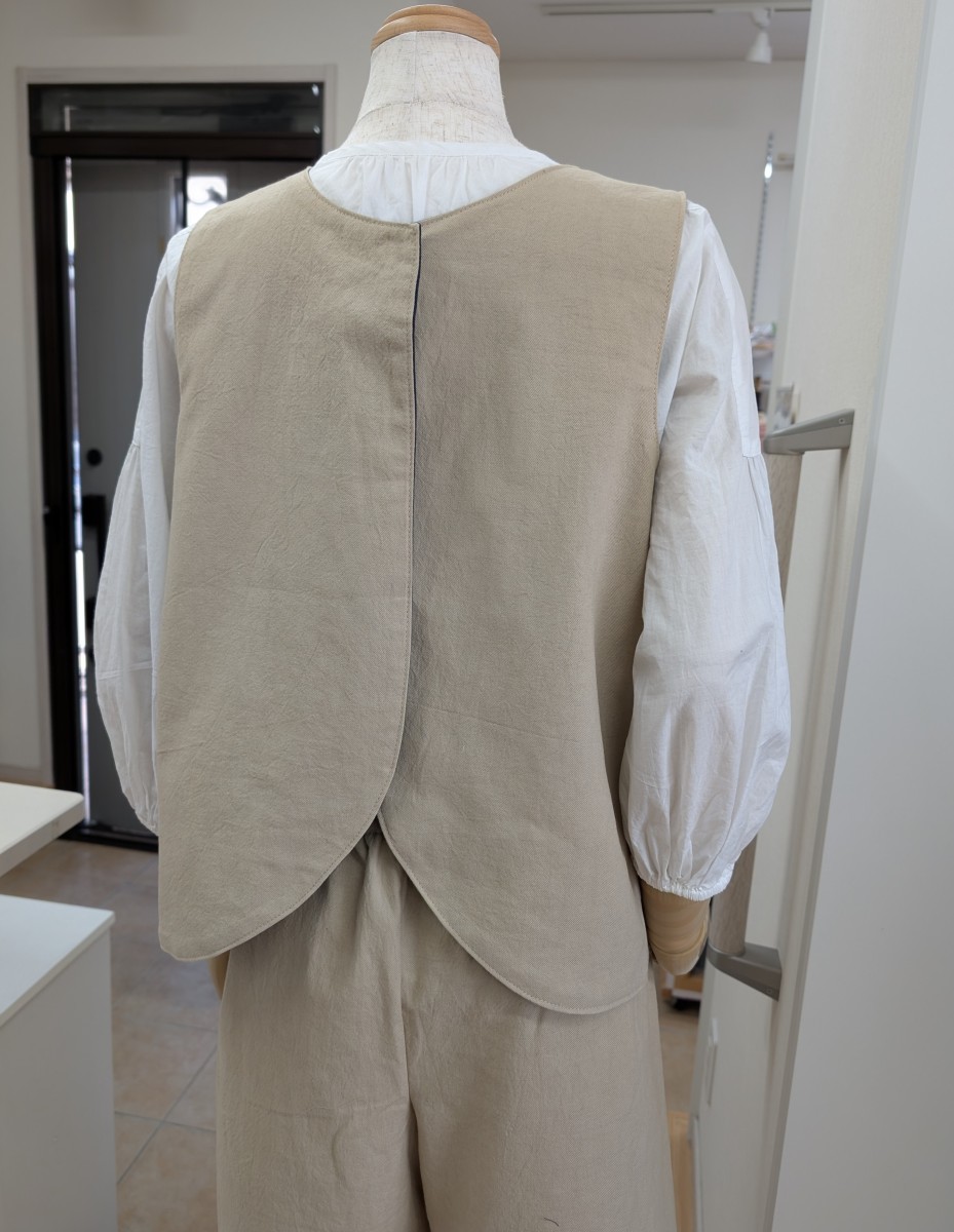 後ろボタンのベストスーツ 洋裁教室人気のセットアップです X Facebook はてブ Pocket LINE コピー 2026.01.25 コットンウール地でベストスーツをお作りのお客様です。後ろ一つボタンの大人可愛いベストスーツです。ベストは前後着用可能。そして、同じ生地で色違い、紺を裏に用いられ、次回は紺生地でパンツをお作りになります。季節、気分に合わせて、何通りにもお使いいただけます。